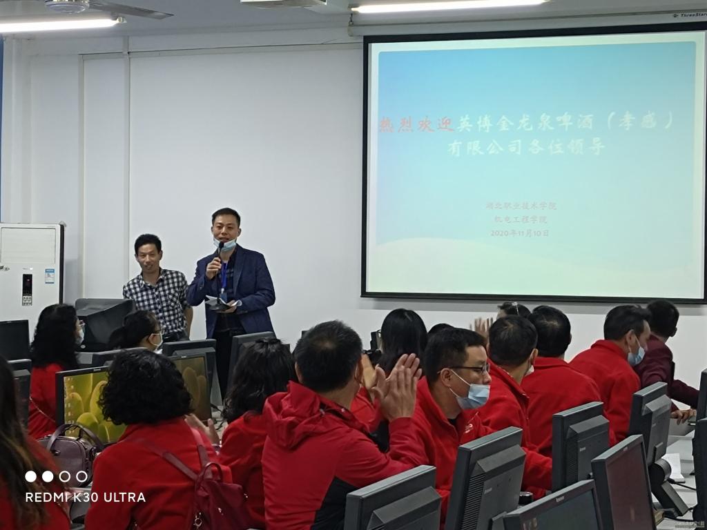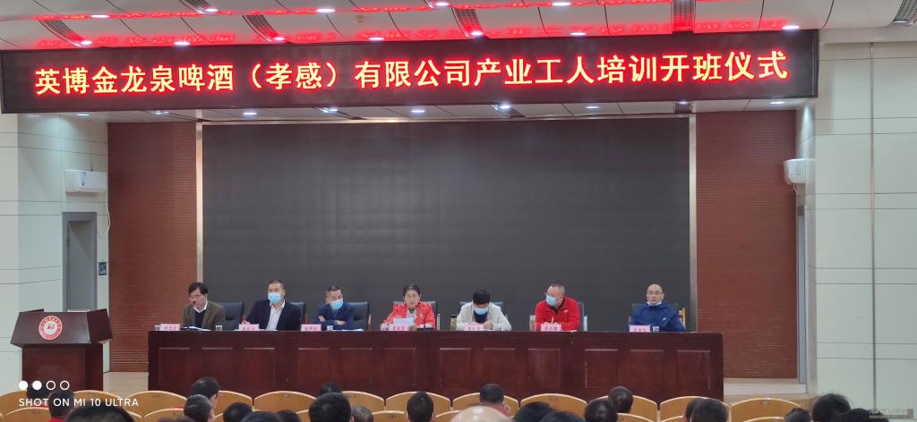 11月10日上午,由孝感市总工会主办,我校培训学院、机电工程学院承办的“英博金龙泉啤酒(孝感)有限公司产业工人培训”在西校区文博馆学术报告厅顺利开班。市总工会党组成员、副主席李朝霞,学校党委委员、副校长李佳圣,英博金龙泉啤酒(孝感)有限公司总经理陶锦红、副总经理\驻厂代表李关雄,以及社会服务中心、机电工程学院负责人及相关人员参加了培训班开班仪式。参加本次培训的对象全部来自于英博金龙泉啤酒(孝感)有限公司技术人员和管理人员,参训职工80余名。