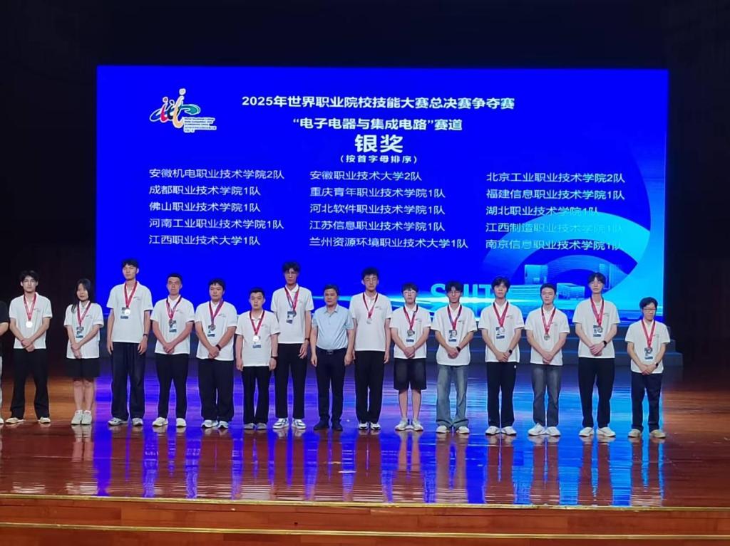 (本网讯周伟、桂宏凡)8月27日至31日,2025年世界职业院校技能大赛总决赛争夺赛“电子电器与集成电路”赛道(高职组)在深圳信息职业技术大学成功举行。本次大赛吸引了全国153支参赛队伍、600余名选手同台竞技。经过激烈角逐,由我校机电工程学院周伟、桂宏凡两位老师指导,熊铭硕、周羽、黄焰霞、乐经城4名学生组成的代表队,凭借扎实的专业功底和出色的临场表现,成功斩获银奖。