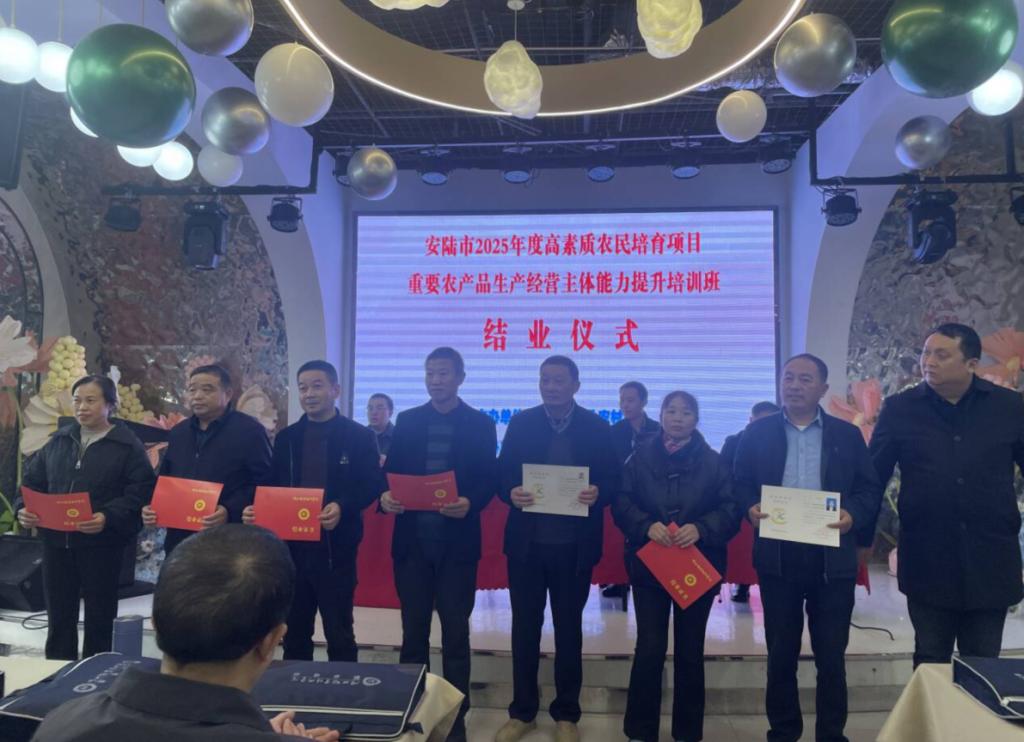 (本网讯:曹艺)10月21日,由安陆市农业农村局主办、我校承办的安陆市2025年度高素质农民培育项目重要农产品生产经营主体能力提升培训班结业仪式顺利举行。安陆市农业农村局张国安,学校继续教育学院、机电工程学院相关负责同志出席结业仪式。59名农药经销人员、家庭农场主、农民合作社带头人、农业企业负责人及骨干等参加仪式。