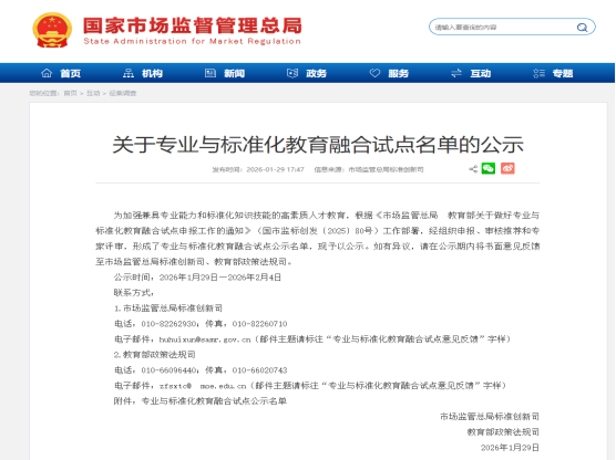 1月29日,国家市场监督管理总局与教育部联合公示专业与标准化教育融合试点名单,机电工程学院工业机器人技术专业成功入选,被确定为“专业教育培养模式”试点项目,试点周期4年。这标志着我校在深化产教融合、创新高素质技能人才培养模式上迈入国家级新平台,实现了学校专业建设的又一重大国家级突破。