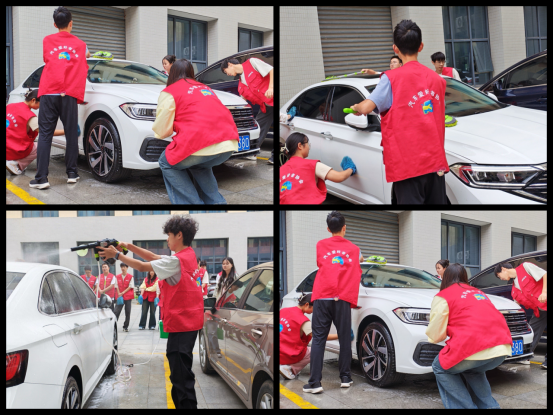 活动现场,同学们分工协作、操作有序。从高压水枪冲洗车身,到专用清洁剂配合海绵细致擦拭,再到车轮、门缝等细节处的深度清洁,每一个环节都彰显着他们对专业的严谨态度。成员们动作娴熟、认真负责,为多辆汽车进行了全方位清洁,优质的服务赢得了车主们的一致好评。