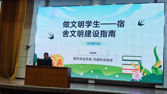 徐佳辉老师带来的《宿舍文明建设指南》创新采用“问题导向+榜样引领”双轮驱动教学模式。通过展示20间优秀宿舍实景图片,解析“最美宿舍”的创建密码;同时曝光常见不文明现象,引发学生深刻反思。“设备报修流程图”“卫生值日表示范模板”等实用工具现场发放,让学生“按图索骥”即可建设文明宿舍。活动现场发起“我的宿舍我的家”共建倡议,收获学生热烈响应。