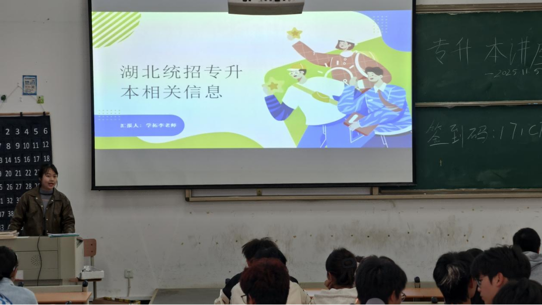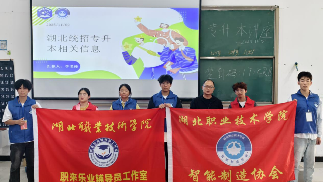 为精准赋能学子升学梦想,扫清政策盲区,规划清晰未来,2025年11月5日,机电工程学院智能制造协会在“职来乐业”辅导员工作室的指导下,联合乐学乐业协会,在南区知行楼8415教室开展了一场以“明晰前路,筑梦本科”为主题的湖北统招专升本政策解读讲座。